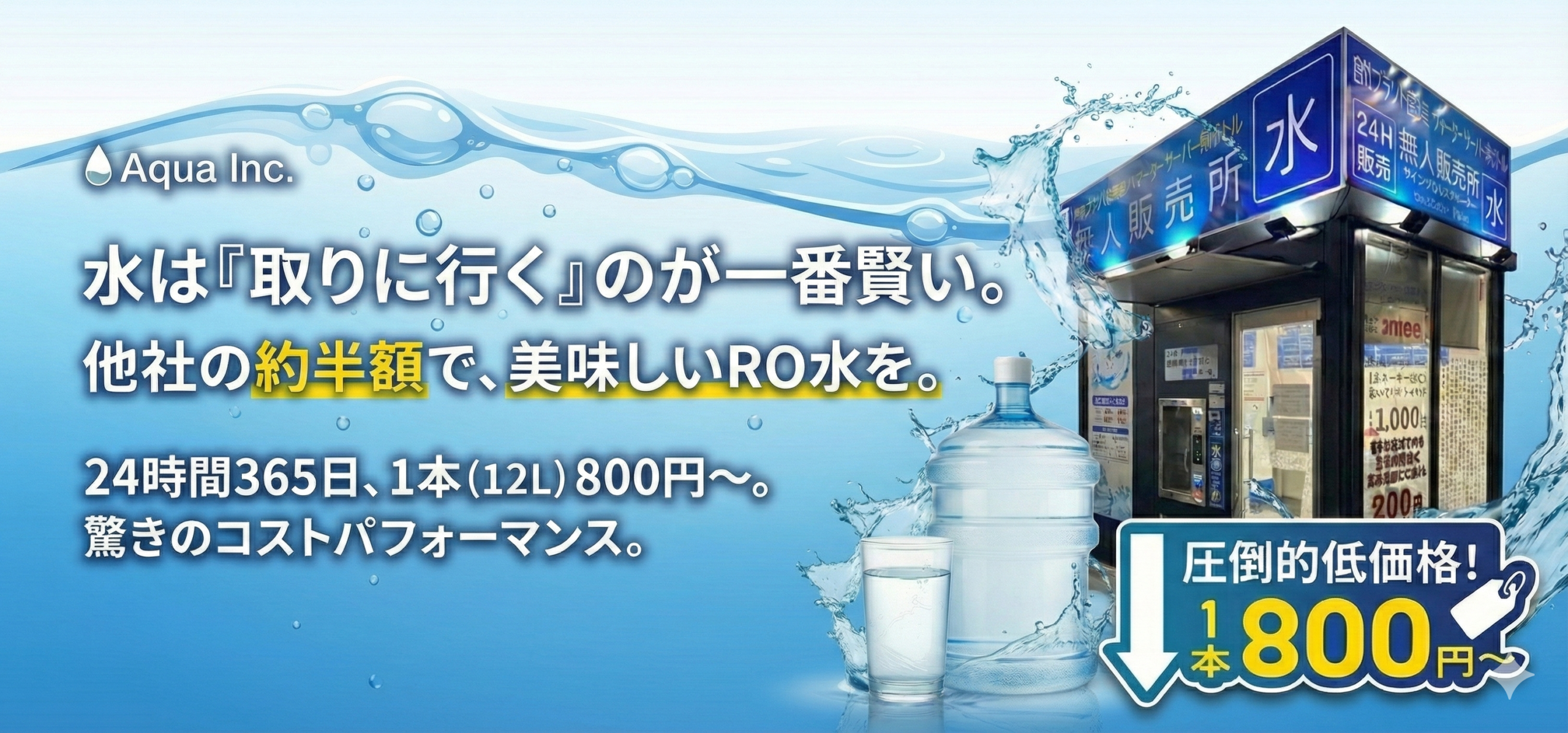 他社の約半額で、美味しいRO水を。24時間いつでも、1本(12L) 800円から。